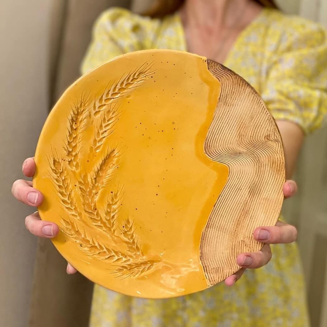 Мастер-класс очень простой, но 2 часа пролетают незаметно. Для того, чтобы сделать одну тарелку, нужно вначале от души простучать кусок глины, раскатать его ровно и тонко, тщательно проверить на возможные пузырьки воздуха. Потом загладить с двух сторон специальной пластинкой. Дальше самое творческое и интересное - придумываем узор, отпечатываем листья, кружева, штампики, фигурные скалки, все, что пожелаете!