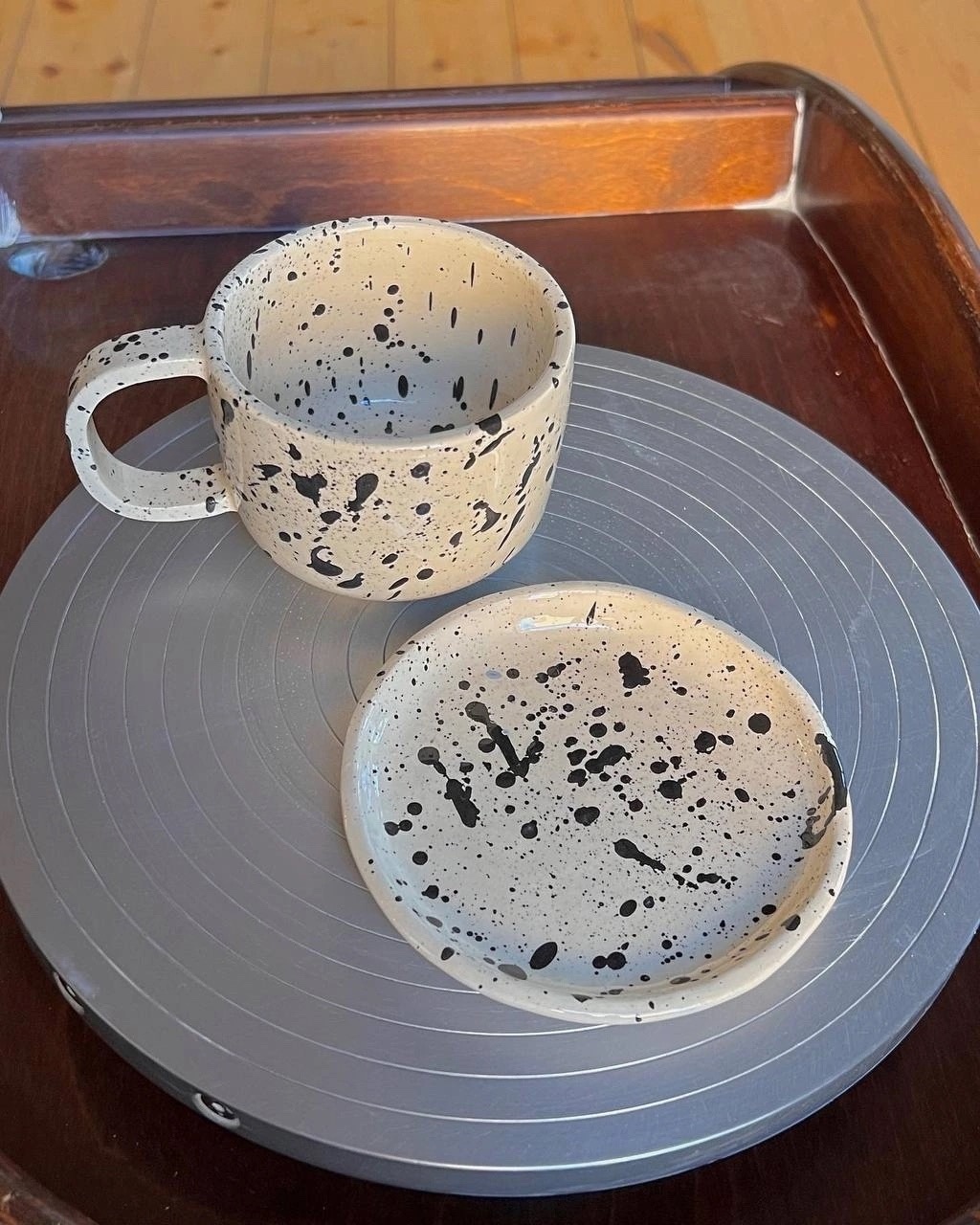 На занятии мы сотворим кружку за гончарным кругом и слепим в пару блюдце! А потом сразу же распишем ее брызгами. Мы предлагаем брать чёрный цвет, но можно взять и другой, если вам вдруг захочется.